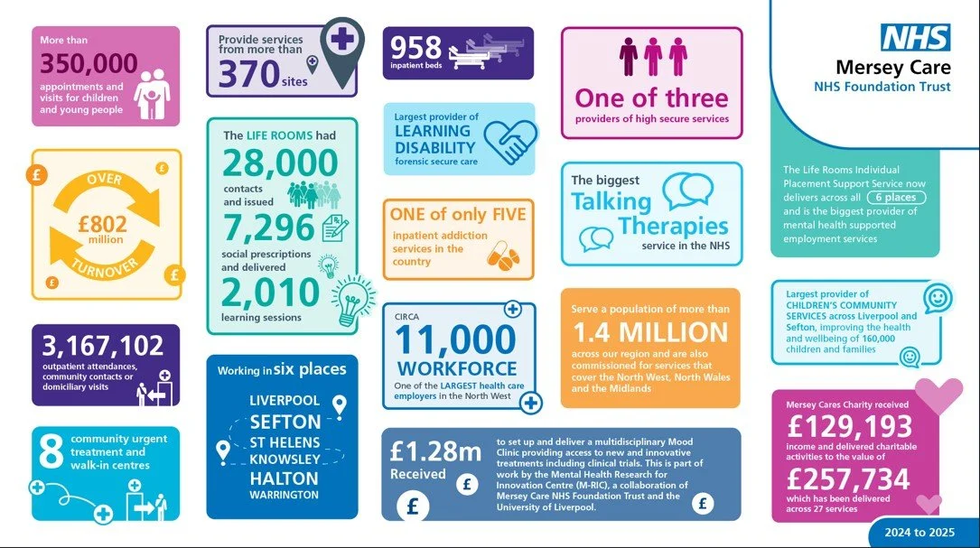 Mersey Care is a large, complex and ambitious foundation trust, providing local mental health, learning disability, autism and community physical health services to more than 1.4 million people across Cheshire and Merseyside, together with specialist learning disability and autism services across the North West. We are also one of three trusts in the country that provide high secure mental health services. Our services reach some of the most diverse communities in England, and our purpose is rooted in delivering excellent, safe, and compassionate care that improves lives and addresses deep rooted health inequalities.