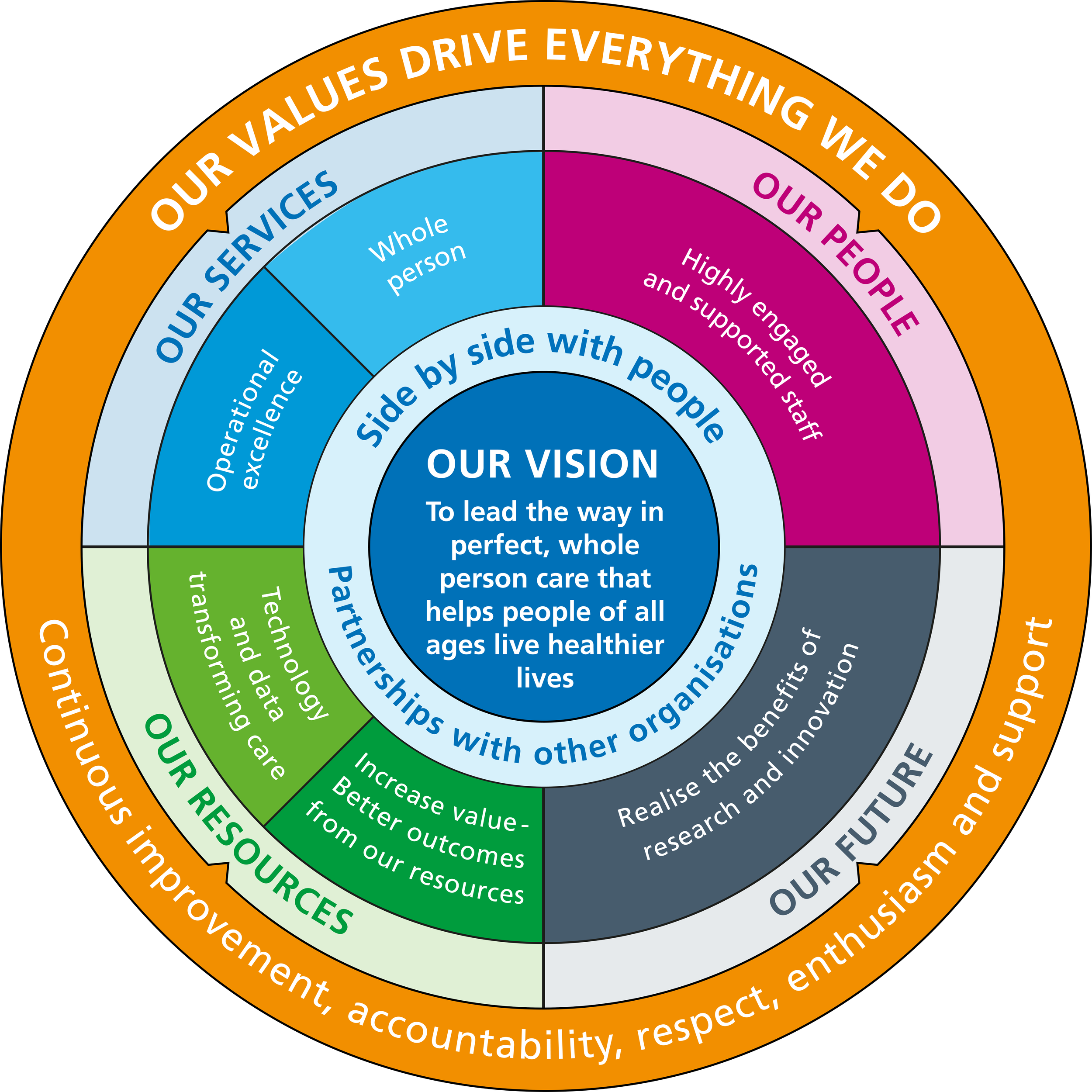 In 2023, we refreshed our strategy to set out what kind of organisation we want to be in 2028. Given our size and complexity, it’s never been more important to have a simple set of focussed priorities to help us get the basics right balanced alongside ambitious goals for the years ahead. The strategy wheel on this page summarises our vision and strategy.